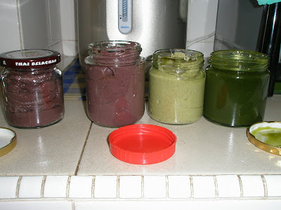 From left : 2 bottles of red bean paste, green bean paste and pandan kaya (my mum used the juice from 40 blades of pandan or screwpine leaves to make 2 bottles of kaya).