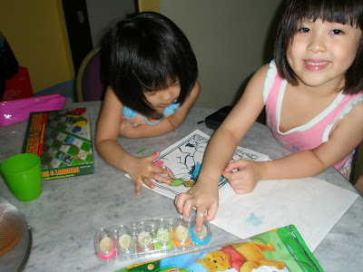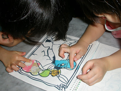 However, this activity needs to be under adult supervision coz my 2 brats were so amused with the magical paints that they kept digging and digging on the paints with their fingers that within 10 mintues, more than half the paints were wiped off… and only 2 pages of the coloring book were colored and there are still over 20 pages in the book, which means that there would not be enough paints for the remaining pages.