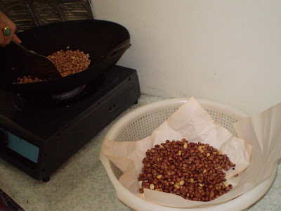 My dad dry frying the peanuts in slow flame in the wok. He then painstakingly spent almost an hour removing the peanut skin under a papaya tree in our garden. Next, my mum blended the peanuts, added some groundnut oil and a dash of salt.