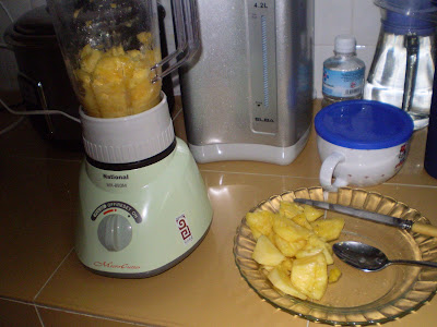 First my dad cut up the pineapple into cubes. Then my mum blended the pineapple and put the pineapple paste into her Kenwood breadmaker.