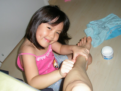 Just as I was about to put Baby C to sleep last night, she poo pooed. After breaking my back washing her bum, I told Alycia who was in my room how painful my back was. Without any hesitation, Alycia quickly voluntereed to massage my back! I was still busy putting the diaper on baby and told her that she could massage me later. But this very eager filial daughter of mine insisted that I lie down on the bed so that she could give me a good massage.   Seeing how earnest she was, how could I turn down such a good offer eh? I then put baby back in the playpen and let her massage me.