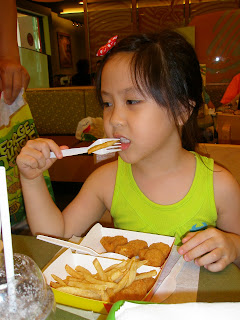 My sweet-tooth Alycia enjoying her nuggets and french fries. She too can’t stop laying her hands on the cup of ice-cream. Though warned by me that she can’t eat too much ice-cream as she has just recovered from a cough, she just turned a deaf ear on my warning… and just sucked and sucked the milkshake with the 3 straws from the cup. Can’t blame her coz the milkshake with ice-cream was really very addictive!