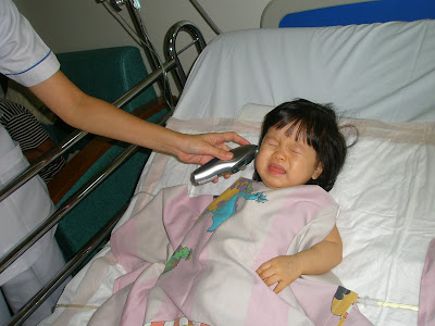 Baby C was taken to the X-ray department again at 8:30am today. It was another round of bawling and struggling for her… and boy do I hate to wear the heavy special protective suit made of plumbum. Our surgeon who viewed the film told us that the pattern of the guts look much better today. There was also some wind at the bottom of the guts, which means that the wind is moving and can pass her guts…. which most likely means no obstruction.