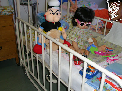 After the surgeon came, listened to her guts through the stethescope and examined her tummy this morning, he told me that he’s quite certain that there is no obstruction of the guts. If her guts were obstructed, she would not have pooped out bits of carrots and there would not be so much volume of poop. Also, if her guts were obstructed, her tummy would look really distended, red and swollen. The x-ray taken yesterday showed that the pattern of her guts is as good as normal. Our surgeon reckons that baby most likely has gastroenteritis. After the surgeon left, when the nurse came to check baby’s temperature, she has developed high fever. The only fluid that baby is allowed to drink now is plain water and clear fluids like diluted ribena or 100 Plus. I have also fed her some Probiotics powder. All we can do now is to pray for divine intervention and be patient.