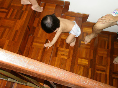 My skinny fler climbing the stairs, under watchful eyes from granny and her 2 loving cheh chehs.