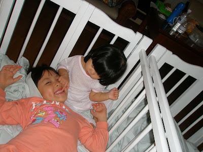 Baby C was finally reunited with her 2 doting cheh chehs on Saturday last week after being away from them for almost a month. The entire Saturday, I just can’t stop myself from singing the song ‘Reunited And It Feels So Good’ ๐ The whole morning while I waited for them to arriveย in Penangย (together with my hubs and parents), I also had a tad worry that baby would not recognize her cheh cheh. Well, baby did cry when she saw so many people in the hotel room as she was napping and was awoken from her nap. After a while, she was comfortable and happy again, especially when her favorite cheh cheh, Alycia climbed into the baby cot and tried to make her laugh.