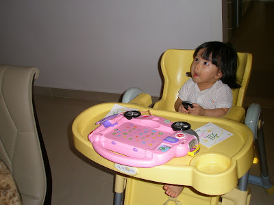 Desperate times call for desperate measures… when all other distractions fail to keep Baby still on her highchair during milk time (fed through spoon-feeding), I will always give her the remote control. Whether it’s the Astro, TV, DVD player or dining table light remote control, that wonderful gadget can surely keep her still for at least 15 minutes.