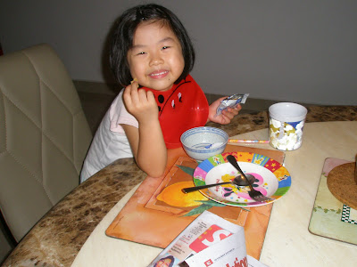 For once, Sherilyn polished off her plate of rice with dishes in a jiffy! Coz she likes steamed seabass fish (which tastes so much like cod fish) and there’s stir-fried spinach, her favorite veggie. To reward her, I gave a packet of sugar-free Iko biscuit.