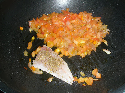 I chopped up 2 medium sized organic tomatoes and 1 medium sized big onion. Then brown them in olive oil for about 5 minutes in a non-stick pan. With the spatula, push them to the side of the pan. Then lightly brown the fish which I had earlier marinated with some sea salt and McCormick mixed herbs for about 5 minutes. I also added 2 teaspoons of Leggo’s bolognaise sauce.