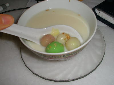 This is our bowl of sesame seed coated, peanut butter, kaya and whole peanut filled tong yuen in soy bean milk with ginger.