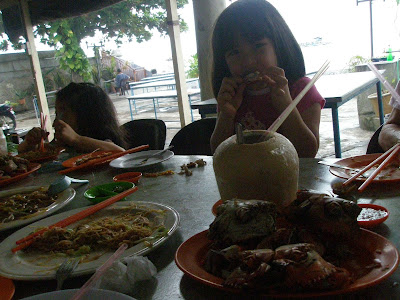 Alycia enjoying the crabs and Baby the spring chicken.