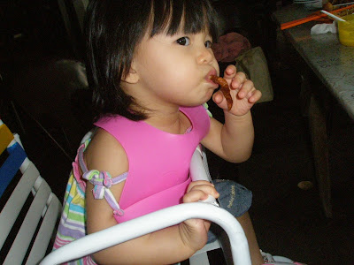 Baby’s first taste of fried spring chicken. She LOVED it and was reluctant to let go of the chicken from her mouth hahahahaha!