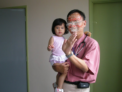 Baby has been very, very, very brave and tough the past few days. Though she has a big bandage on her hand, with a needle poked into her hand with the IV catheter, she hasn’t complained of pain or fussed a wee bit. She even allowed the doctor to carry her… and she even said bye bye to me when I pretended to leave the hospital with the maid. When the nurse injected the antibiotics into her hand through the IV catheter, she did not budge or whine a wee bit. She just sat on the bed obediently and quietly while observing the nurse.