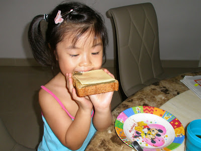 Tell me, do you think a kid will go malnourished if she just eats bread with cheese and coconut jam (kaya) + 1 glass of milk everyday and nothing else? Probably not eh? Bread is carbo + protein, cheese is calcium + protein and kaya is high in protein + carbo. Hmmmm, maybe I’ll just serve this little girl with bread + cheese + kaya everyday till she screams fed up. I tell yer, this girl just lurves this stuff and if my mil doesn’t complain, I will just feed her with this everyday haha! It’s fuss free, stress free, she’s happy and I’m happy 😀