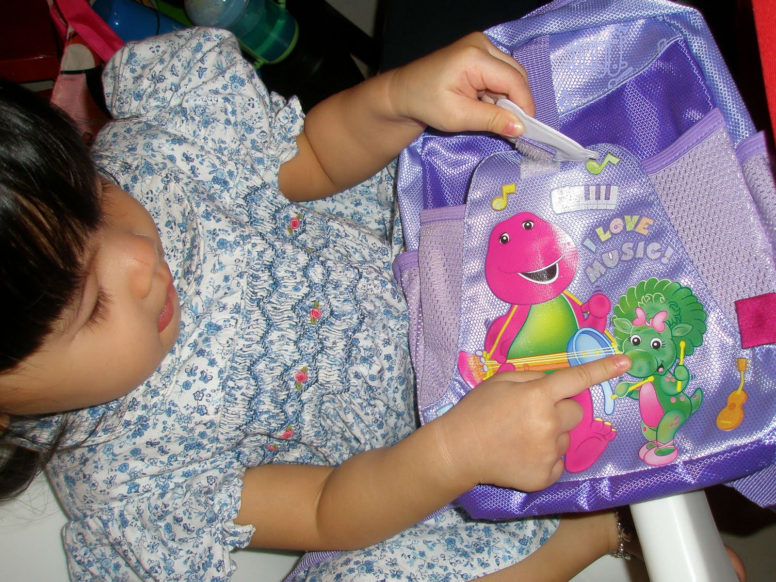 Daddy searched high and low for a Barney toy or bag for his Barney-crazed little girl and finally got her a small lilac Barney bag…. which Baby had absolutely no interest in 🙁