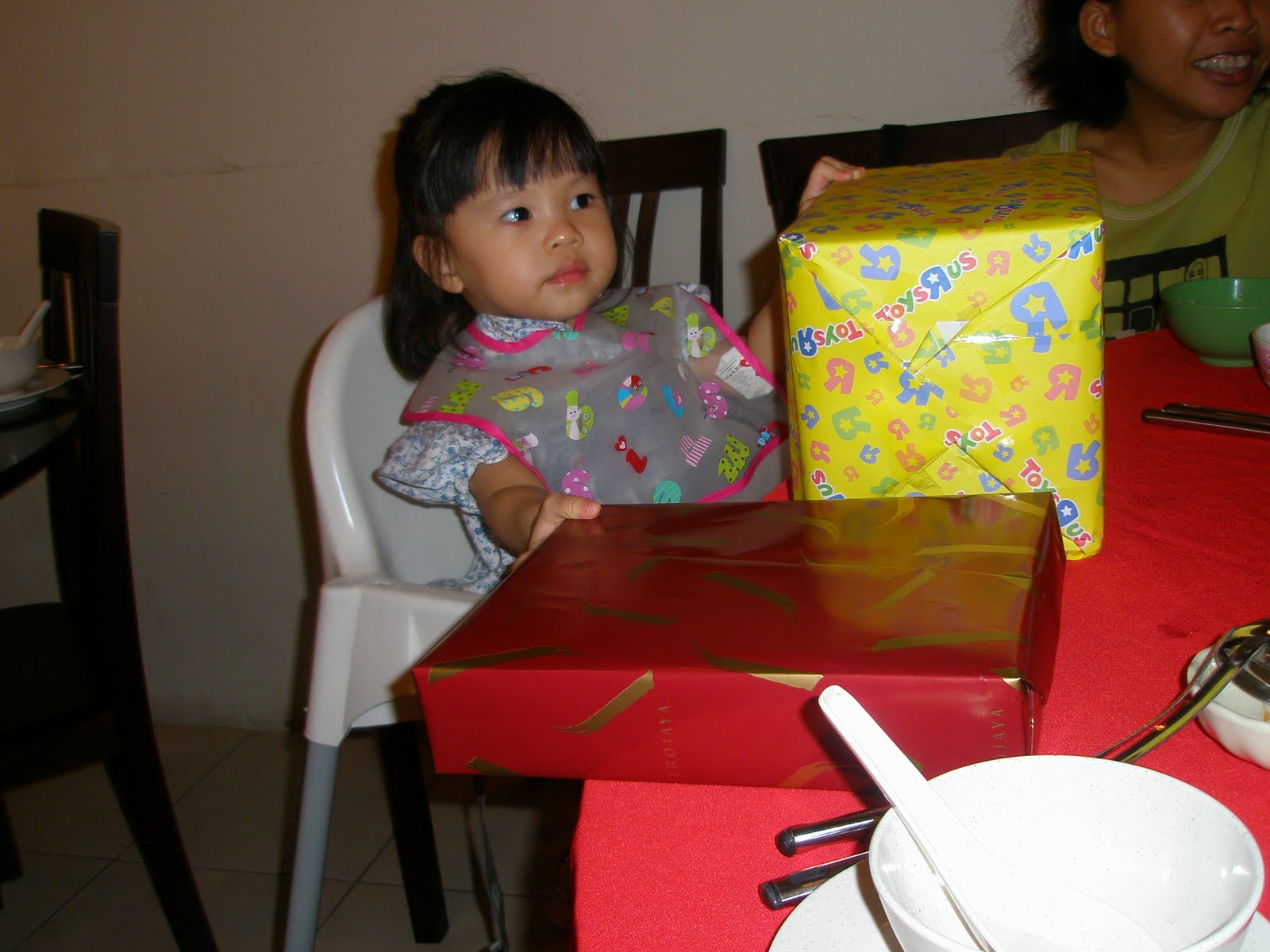 Pic taken at the restaurant. One present was from daddy and one from khai yeh (god father). Both the girls’ god fathers were at the steamboat restaurant.