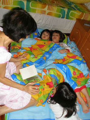 My 3 girls LOVE going to their koong koong and granny’s in Ipoh. When they are back in Ipoh, they are spoilt rotten by the ever indulgent grandparents. My dad, he will bring the girls to buy ice-creams, chocolates, junk food and bring them for walks by the hill side to see the old mother goose (which they love, though they were often chased by it!) monkeys and horses. They look forward to cycling on their bicycles and playing in the wading pool. My mum, she will make them kaya, jams, bread, pies, cakes, cookies and do many fun activities with them. One of the activities is reading bedtime stories.