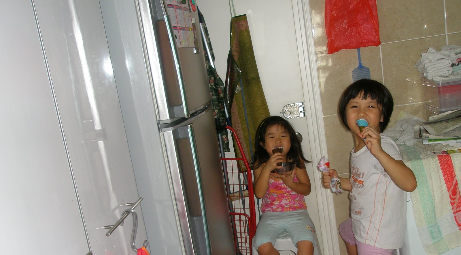 Here, Alycia and Sherilyn are having a feast with ice-creams and they are hiding in the wet kitchen LOL!  I have to stand there on guard, lest the 2 monkeys try to creep out and tempt Baby. Yup, they just love tempting their baby sister, aargggghh!!!