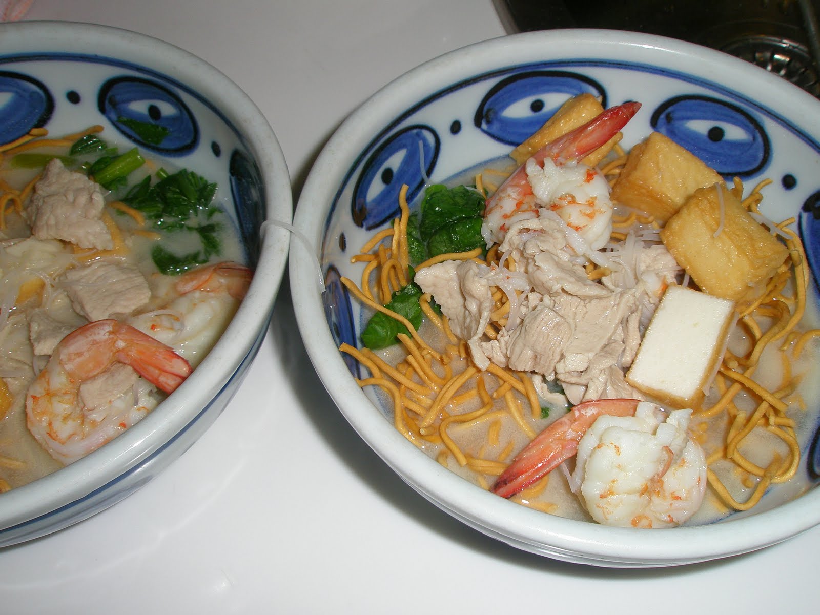 Tofu fish balls, pork slices, prawns and veggie boiled in fried fish soup. The ingredients and soup are then poured over the uncooked crispy yee mein. My kids loved it!