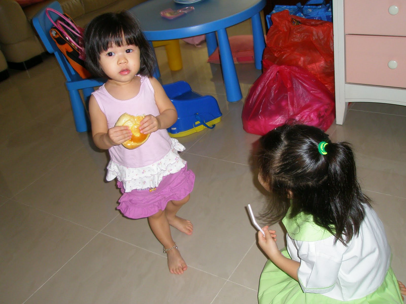 Caught on camera again…..this little scavenger and opportunist again climbed up the dining table and grabbed the custard bun that her 2nd jie jie had left there…. and before anyone else caught her, she quickly stuffed the bun into her mouth! Her 2nd jie jie was enraged I tell yer!