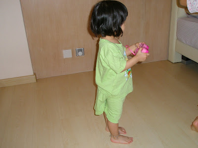 Baby started to learn dressing herself up several weeks back at 2yrs 4 months.  She looks too cute each time I see her trying to wear her pants by herself.  She would push me away and refuse my help as she says “I wear myself” whenever I try to help her.  She’s smart enough to sit on a chair or lean against the wall when she wears pants.  But at times, she will put both her legs into one side of the pants and look really silly and hilarious, like this….