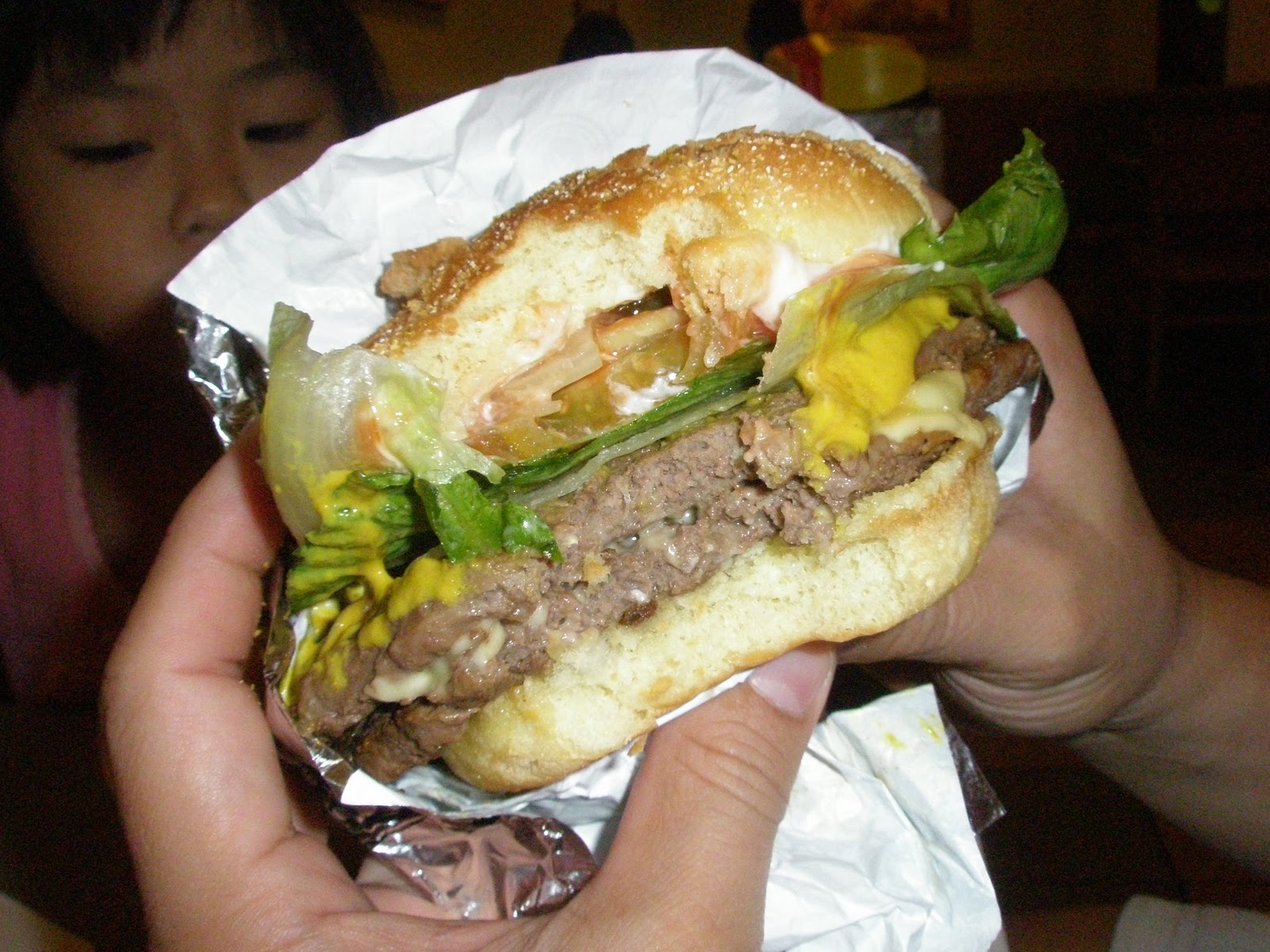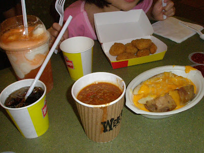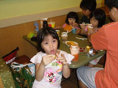After swimming, we had supper  dinner at Wendy’s.   There were nuggets, baked cheesy potato, Chillies, ice cream float, soft drinks, fries and burgers.  Gosh it was a super artery clogging and high carb meal.  While daddy had a feast with the girls, I was busy snapping pix and only ate 1 spoonful of Chillies, 1 spoonful of ice cream and a bite each of everything.  I can be very determined and can resist the strongest of temptations when it comes to eating after 9pm.