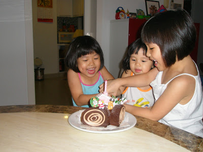 The next day, the girls finally cut the Xmas log cake. Daddy had bought it for the Xmas party on 25 Dec but there were too much food so we held back the cake…
