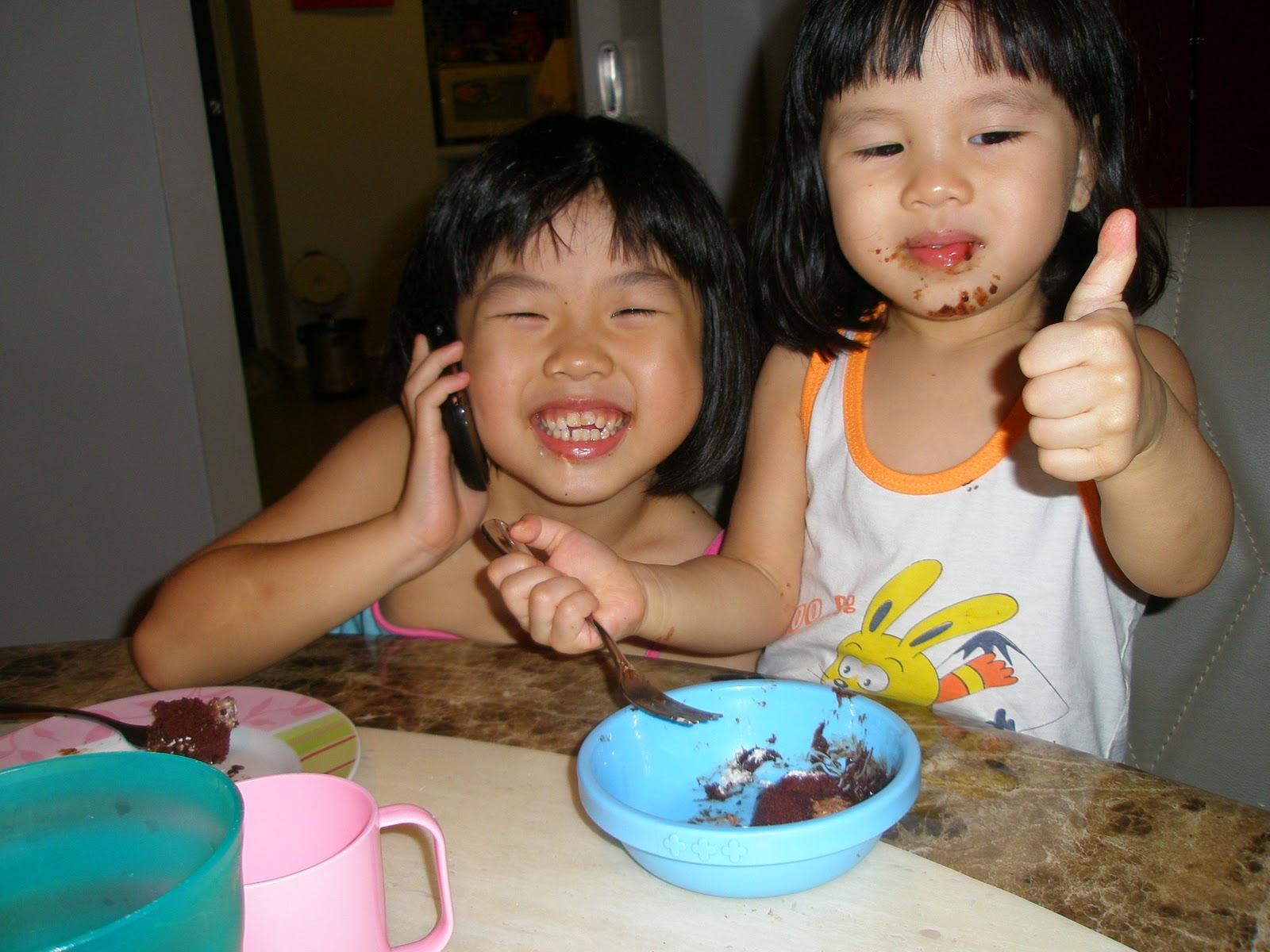 Baby giving her thumbs up to the chocolate log cake. She chomped down a few slices of cake.. This girl can really eat like a pig when it comes to cakes and snacks.