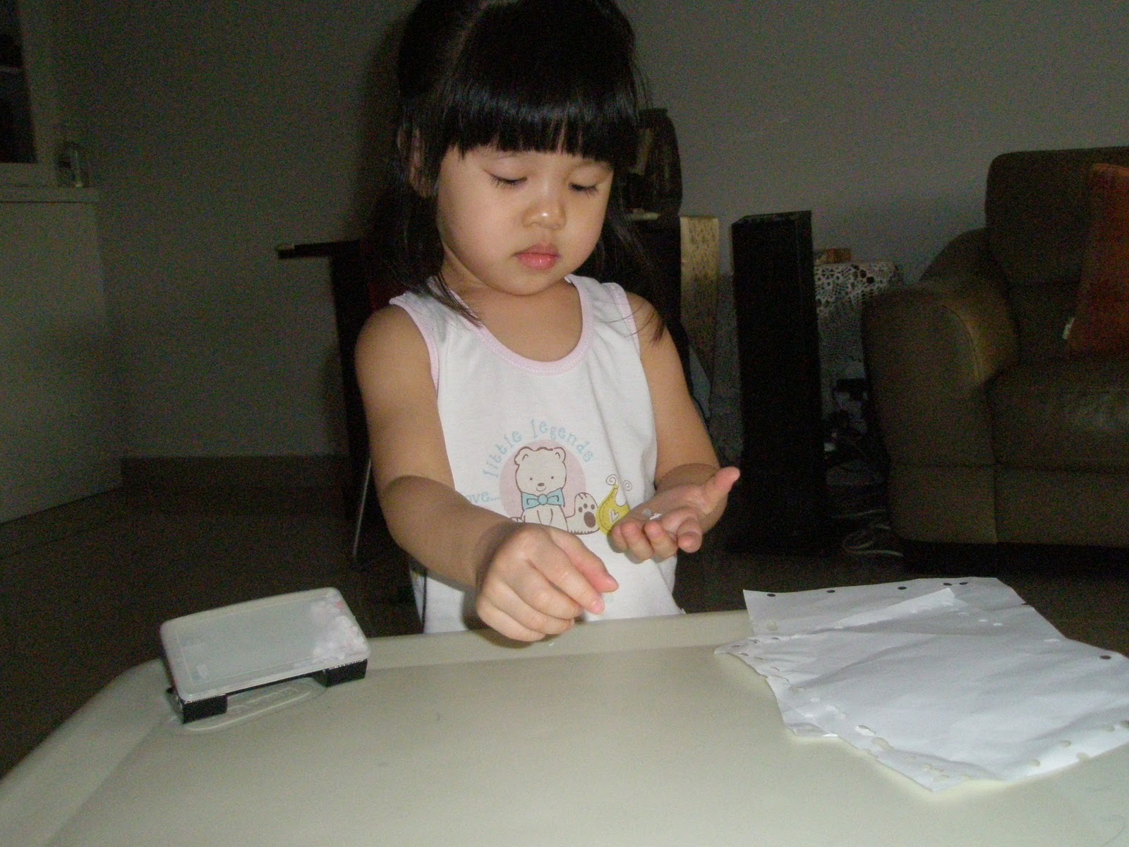 Whenever I am busy with work, Baby will play on her own if her 2 sisters are at school. Some of the things that will keep her occupied are punching papers with a paper puncher, doodling, playing Lego blocks or she will simply climb up to the top of the couch and then slide down as if it were a slide! Sometimes she will bring out the vanity bag and play hairdressing on my hair, at the expense of my precious locks, with gobs of them on the floor after each session! The tellie is another good babysitter but I am not too keen in allowing her to watch the idiot box the whole day. Sometimes she gets so engrossed watching that she will shut her ears to my calls. The same goes with my 2 older girls. I have now set a max of 1-2 hours of TV viewing on school-going days for my girls.