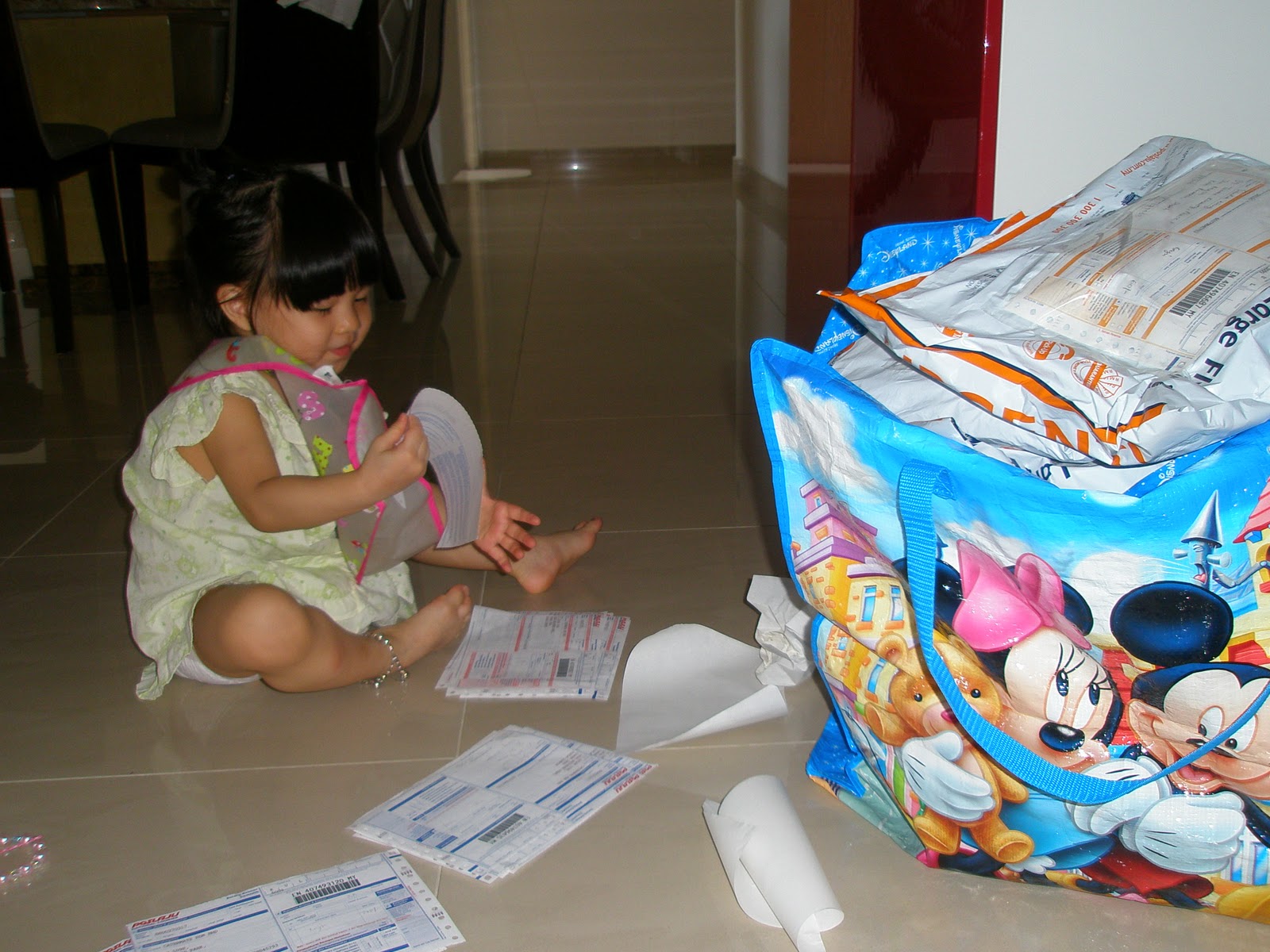 Here is my grossly under-aged store assistant and she is not even three yet. She now knows how to help me separate the Pos Laju consignment notes into 2, which requires a degree of dexterity, something which sometimes my 2 older girls have trouble doing. I was really impressed when she insisted that she wanted to help me (I really under estimated her and thought she would not be able to separate the carbonized copies) and then TA DAA…. she proved her capability in a jiffy. Now, she helps me do this everyday!!