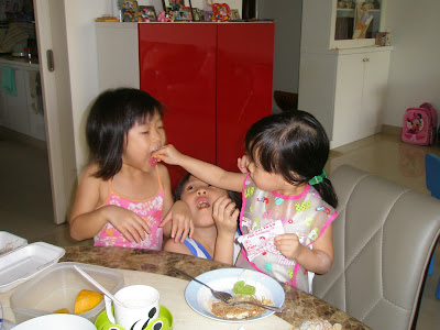 Sunday is a junk food day and I allowed them to eat fish muruku. Baby the cili padi insisted that she had to hold the packet of muruku and refused to share it with her 2 jie jies. But when her 2 jie jies pretended to be puppies, she relented and fed her sisters the muruku like a master rewarding her pups LOL!