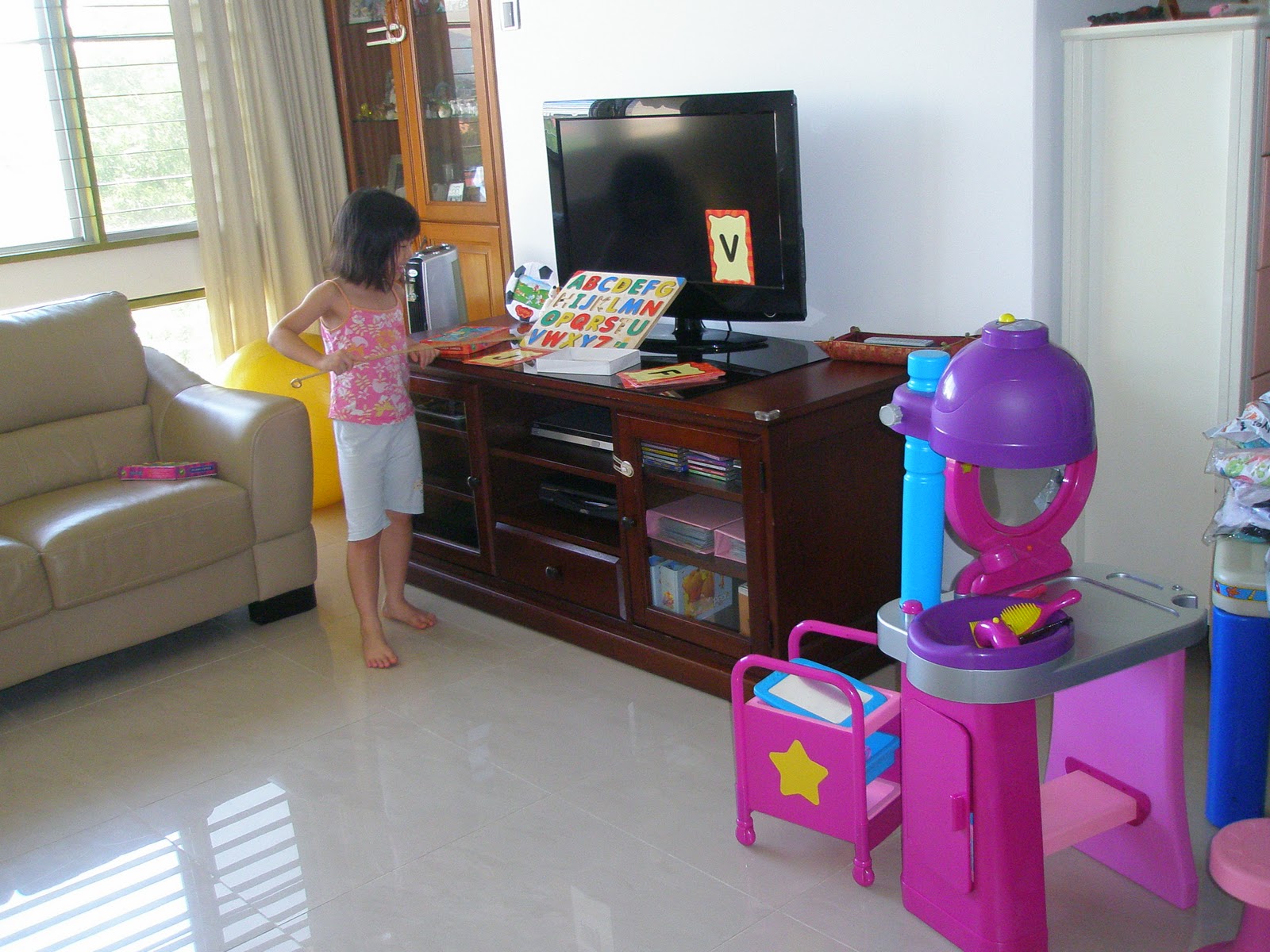 Here, Sher’s teaching her baby sister ABCs… after spending the whole morning outside the house. We had gone for a morning walk and did some exercise on one Sunday morning. Well, the more oxygen that goes into our brain and body system, the better the brain functions. I used to bring Alycia and Sherilyn for walks and runs everyday without fail before Baby came along. I knew how beneficial exercise is to a growing child (and to adults too for that matter) and how important oxygen is for our brain. Shame on me that I have laxed on our exercise regimen terribly ever since Baby came along. I must must must make an effort to start the girls on a regular exercise regimen again.