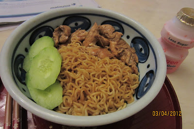 Instant noodles flavored with sesame seed oil, a few drops of thick soy sauce and sodium-reduced soy sauce. It would taste better with fried onion oil but due to time constraint, I skipped this. Well, the noodles was tasty enough without the fried onion oil or the sachet of MSG. I also made some pan-fried Terriyaki chicken fillet and sliced up some cucumbers to dispel heatiness.  Every strand of noodles was polished off!
