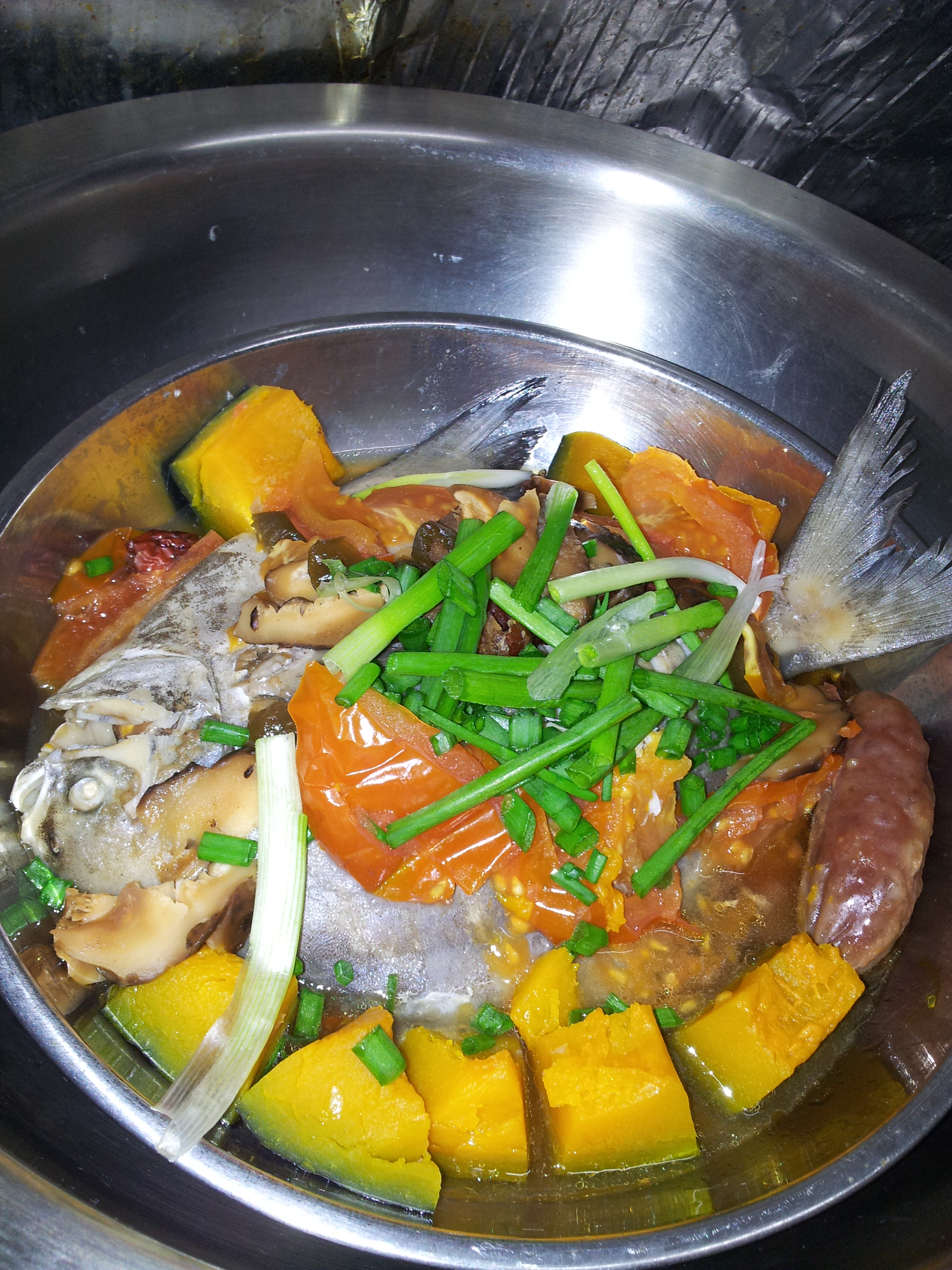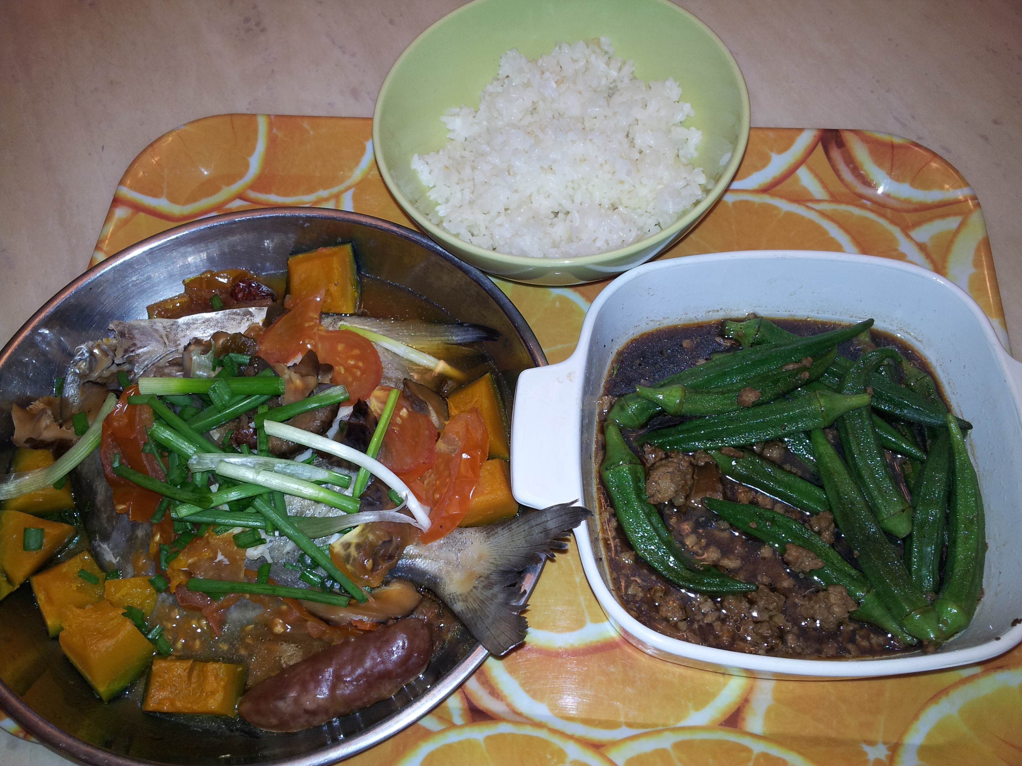 Steamed pomfret fish (tau tai chong) with mushrooms and red dates (I always use these 2 ingredients to expel the fishy odor if I steam the fish), tomato, organic Japanese pumpkin wedges and I threw in a piece of lap cheong (Chinese sausage) as I was craving to have it last night *sinful*!