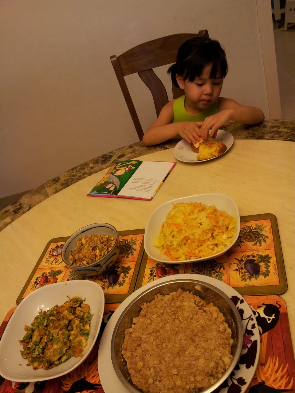 Our dinner on Wednesday — stir-fried cabbage with julienned carrot, steamed minced pork with water chestnut, french beans omelet and a fried rice left over from lunch.