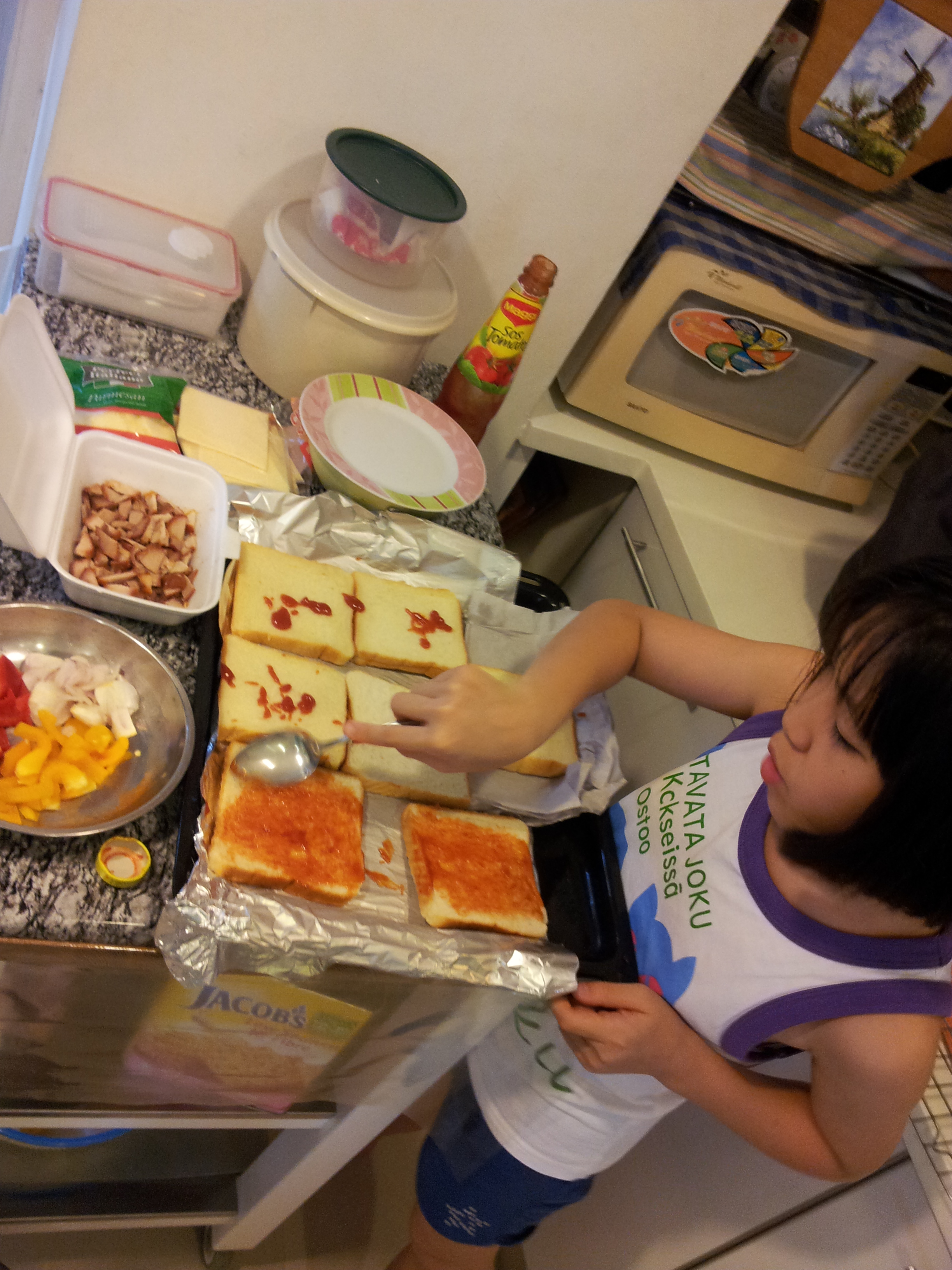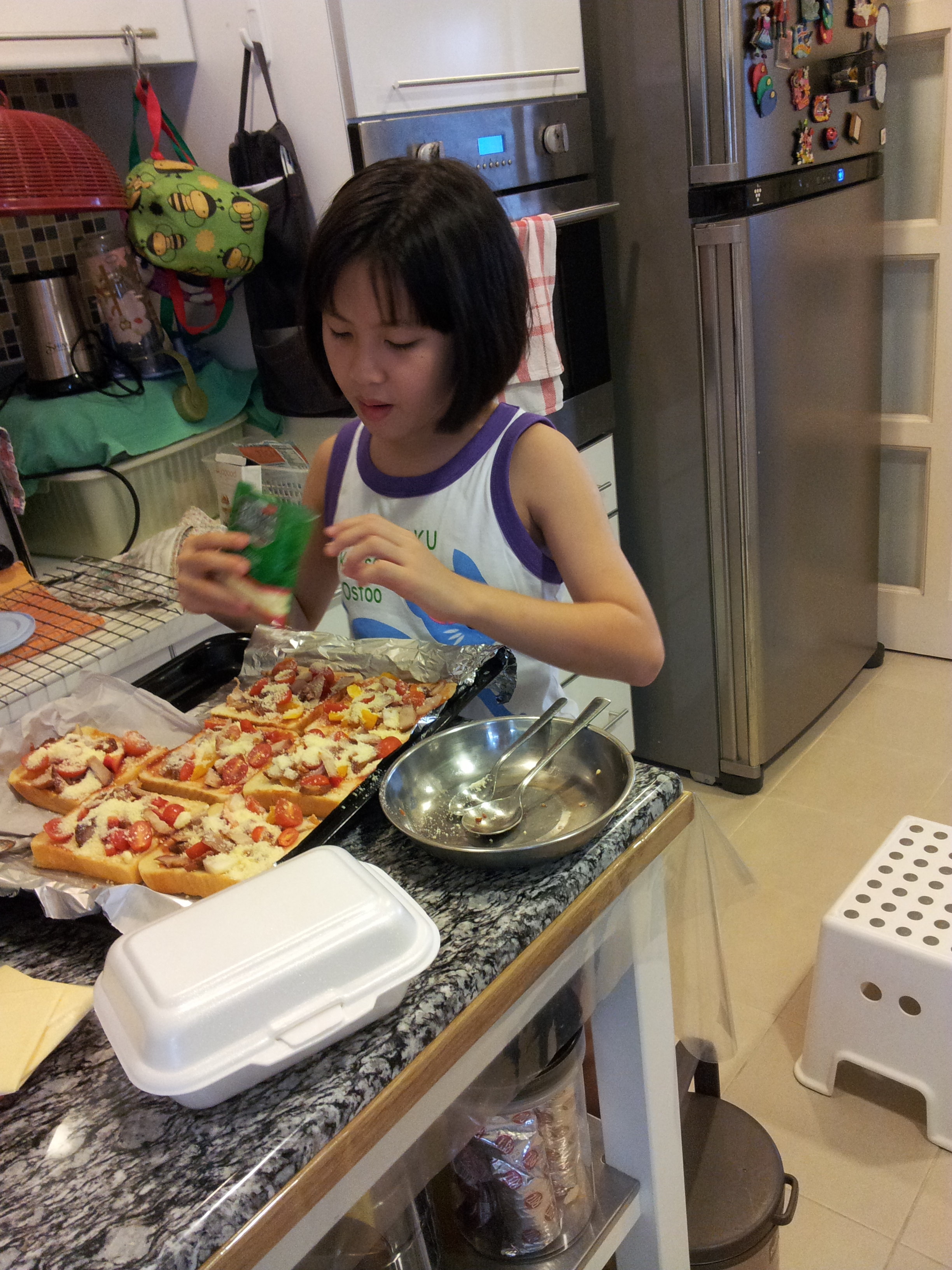 Pizza bread is so easy to prepare that my almost 10-YO Alycia can help me with it.