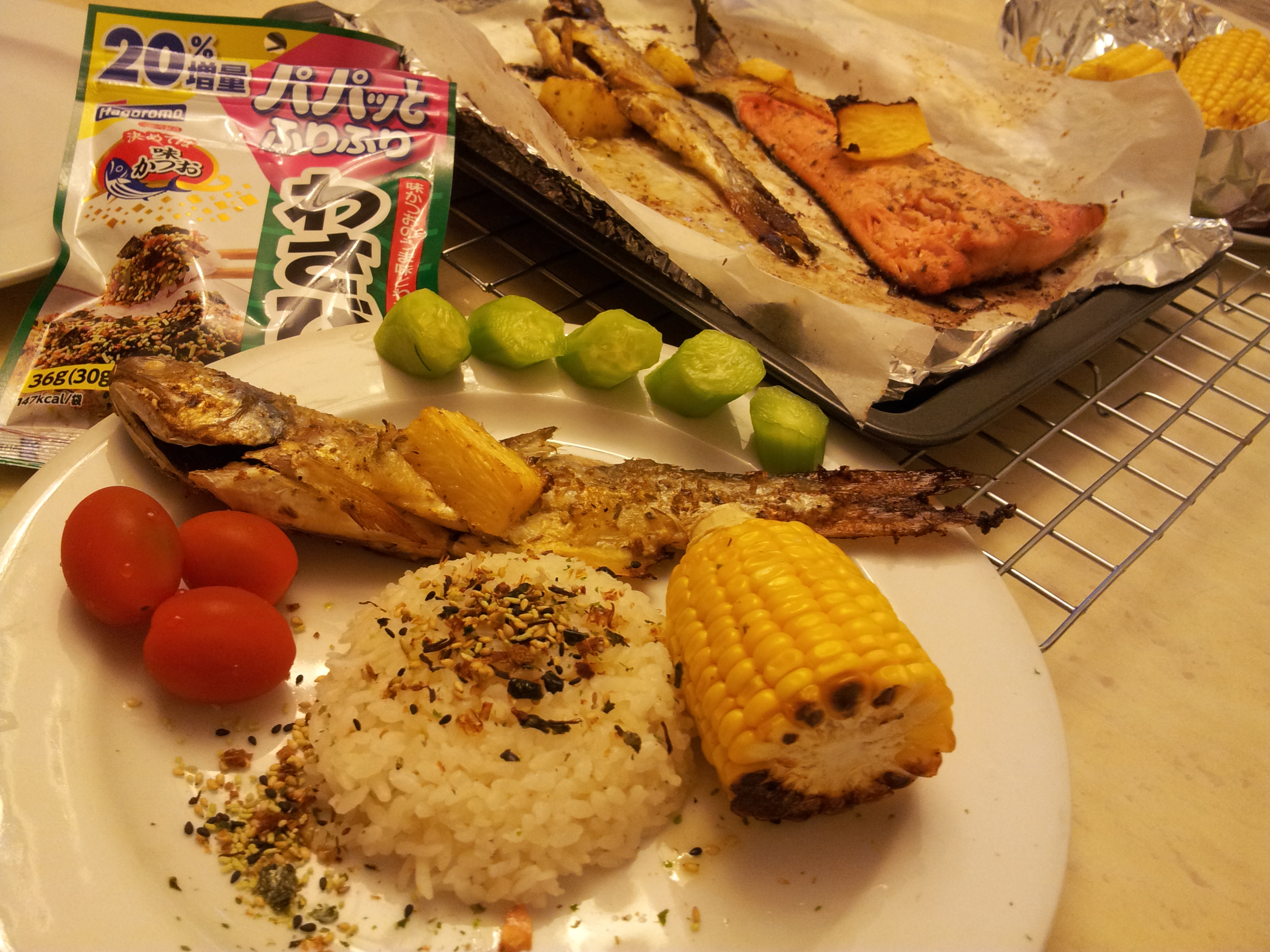 The fish was served with Japanese rice and Japanese rice condiment, grilled sweet corns, cucumbers and cherry tomatoes.  It was one of the easiest dinner to whip up ever, with almost zero oil splatter. Well, I had to lightly wipe the oven after use.  Tonight’s menu will be grilled chicken with pineapples and I can foresee the girls grinning while they chomp on the delish and fruity chicken drumsticks 😀