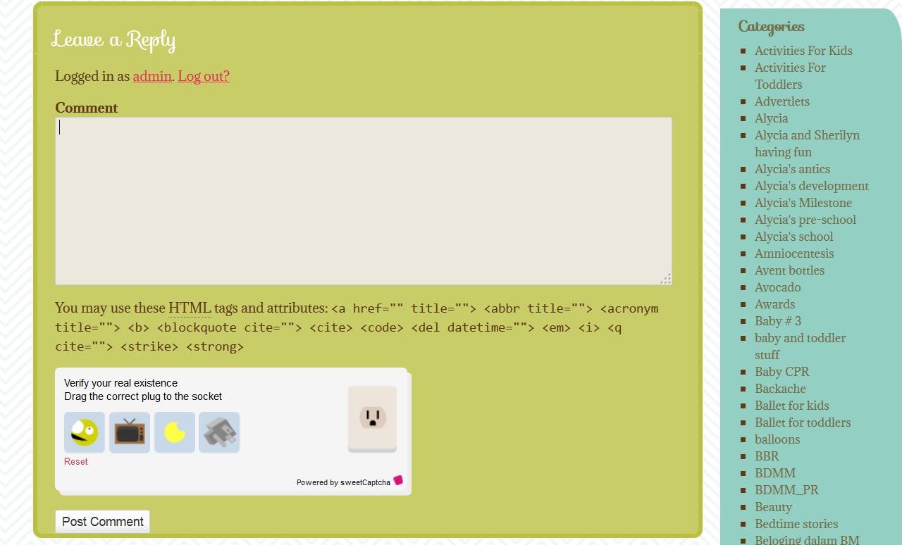 Below is a print screen of what you will see when you comment in my blog post. You will see at the bottom of the blog post after you have clicked ‘Leave A Comment’ or ‘xx Thoughts’ a box on ‘Verify your real existence’ . Here there will be an easy puzzle for you to solve each time you leave a comment (different puzzle each time). All you need to do is to drag the correct picture to the puzzle box on the right side. Easy peasy only 😀