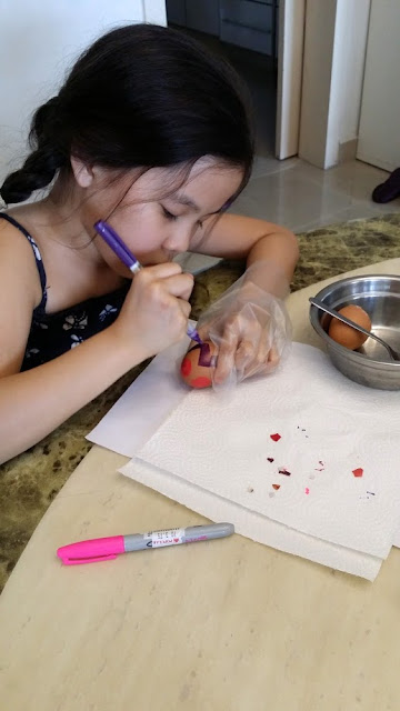 Back home, Cass did Easter egg painting while her 2 che ches followed daddy to a basketball match, along with their two little uncles (8 and 9 years old) who arrived from London a few days back. Later, Cass cycled and then played football with her che ches and 2 little uncles at the pool area. She was totally knocked out by 8:30 pm and so was everyone. The weather was really hot and humid yesterday at 39 degrees Celcius and we finally succumbed to cooling off the living room area with the air-cond. Heck the RM600 electricity bill! We just wanted some sanity and enjoy our Sunday at home! 😀