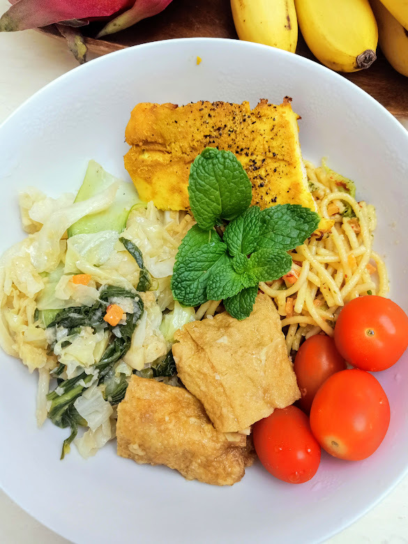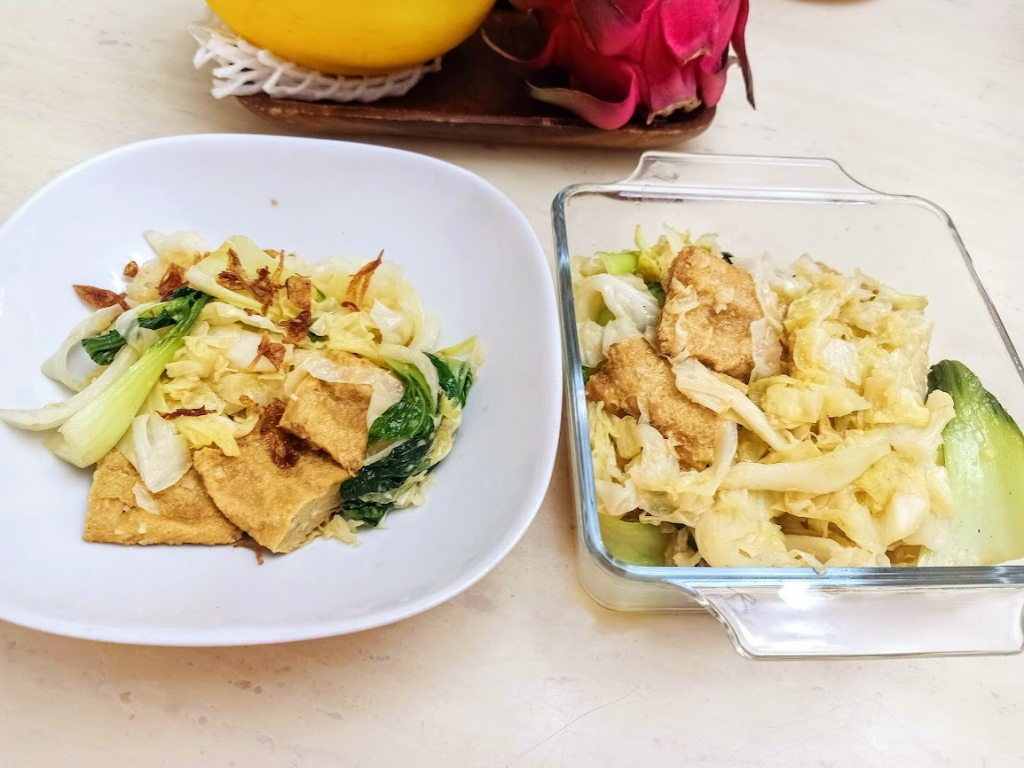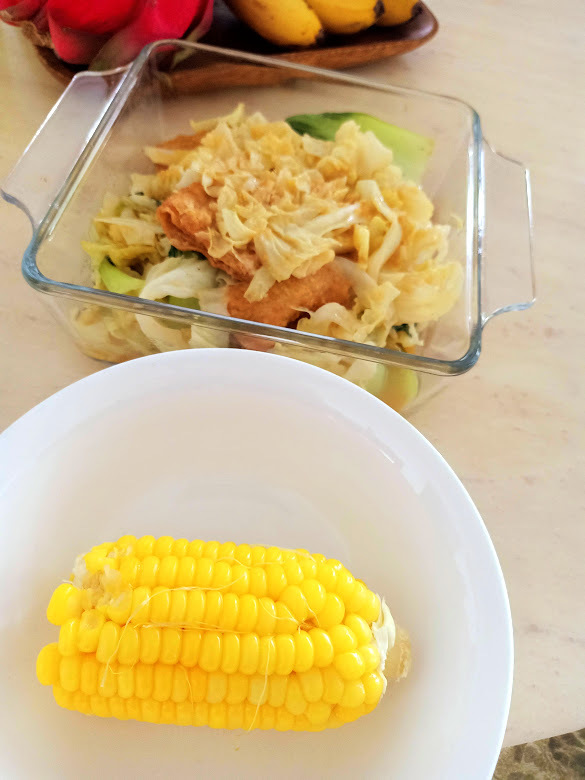 Yesterday I stir-fried cabbage + bok choy + foo pei and that was what I ate for lunch and dinner. I also ate a quarter slice of air-fried marinated Beacon chicken breast, half a sweet corn, low-fat plain yogurt with sunflower seeds and lots of fruits. Today I had steamed fish, steamed chicken and a boiled sweet potato for lunch and dinner.