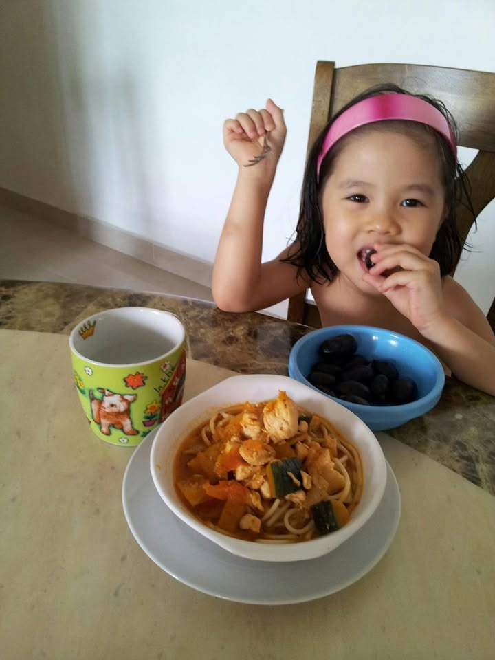 In the photo, Cass had just returned from kindergarten and was enjoying her lunch that I cooked—spaghetti with pumpkin, tomatoes, and chicken. I vividly remember those times when I cooked two fresh meals daily, lunch and dinner, for the girls. Almost everything I made was from scratch, ensuring that they had nutritious, wholesome meals. Back then, I had the luxury of a live-in maid, and later, a part-time helper who came over every evening. Having a helper around made cooking a joy because I didn’t have to worry about the aftermath—washing up!