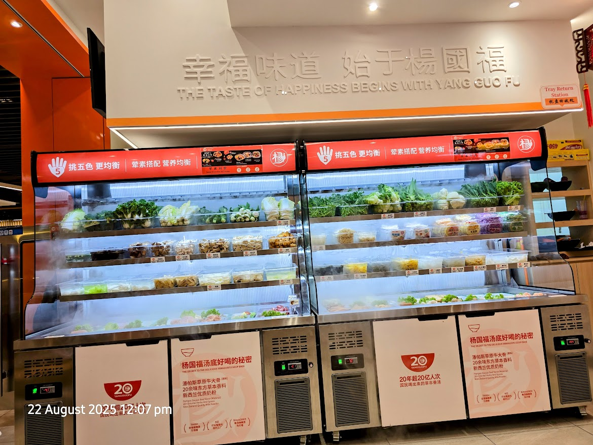 After a quick tour of the exhibition, we were ready for lunch. We wandered through a few floors of the mall, browsing the endless food options, and finally decided on Yang Guo Fu Malatang. For those who haven’t tried it, Malatang is a customizable Sichuan-style hotpot. You get to choose your own ingredients—from fresh meats, seafood, vegetables, and noodles—from a large chiller. Then, you select a broth base, like their signature beef bone, chicken collagen broth, or tomato broth, and they cook it all for you in a flavorful dish.