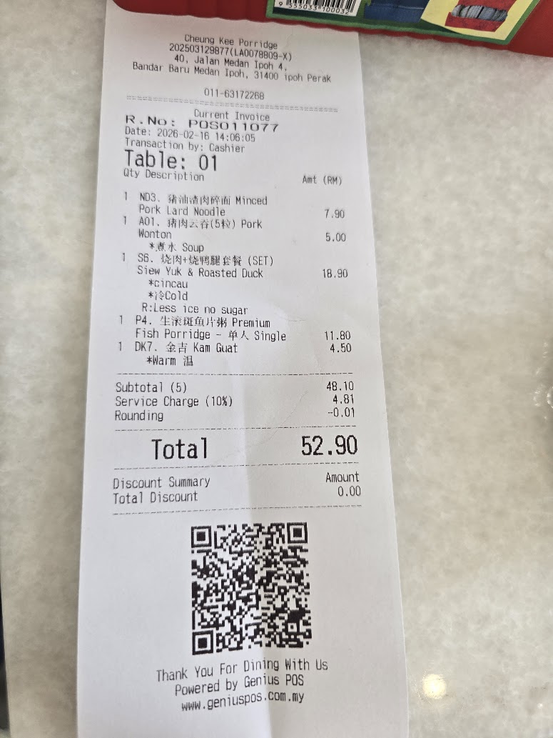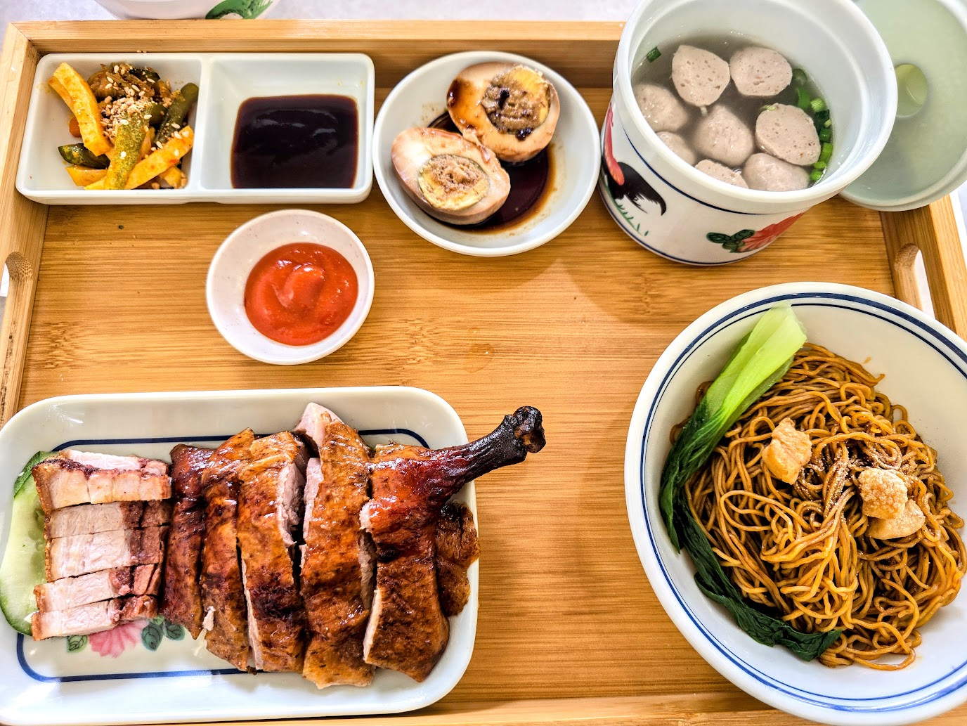 We were so glad we went in. Everything we ordered was delicious — pork lard + minced pork wantan noodles, duck and siew yoke wantan noodles, and premium fish porridge. The kumquat (preserved lime) drink was refreshing, and I loved my sugar-free cincau drink too.
